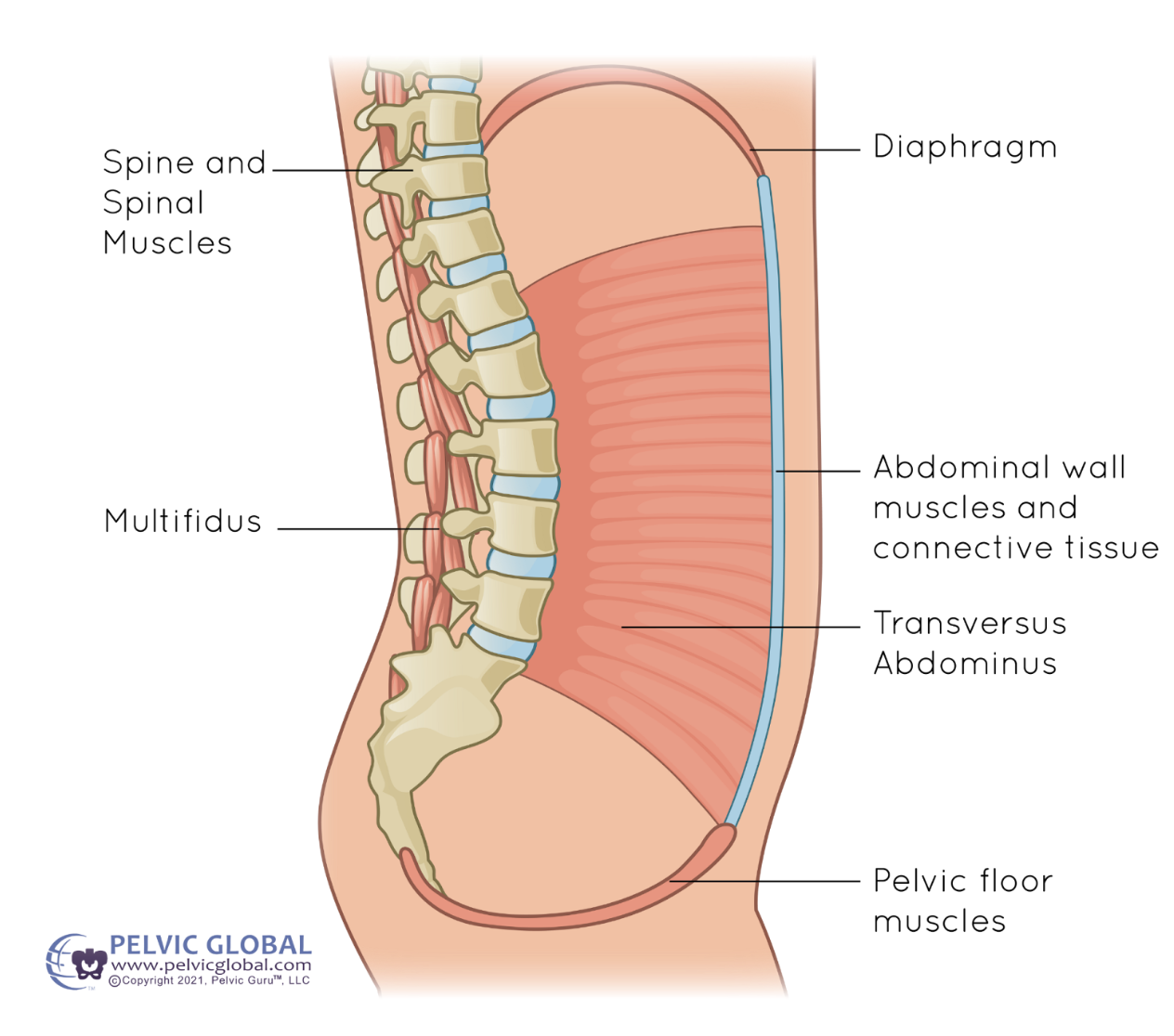 The pelvic floor works together with other muscles of the core, including the diaphragm, the multiple layers of abdominal, and the low back muscles, to function properly.